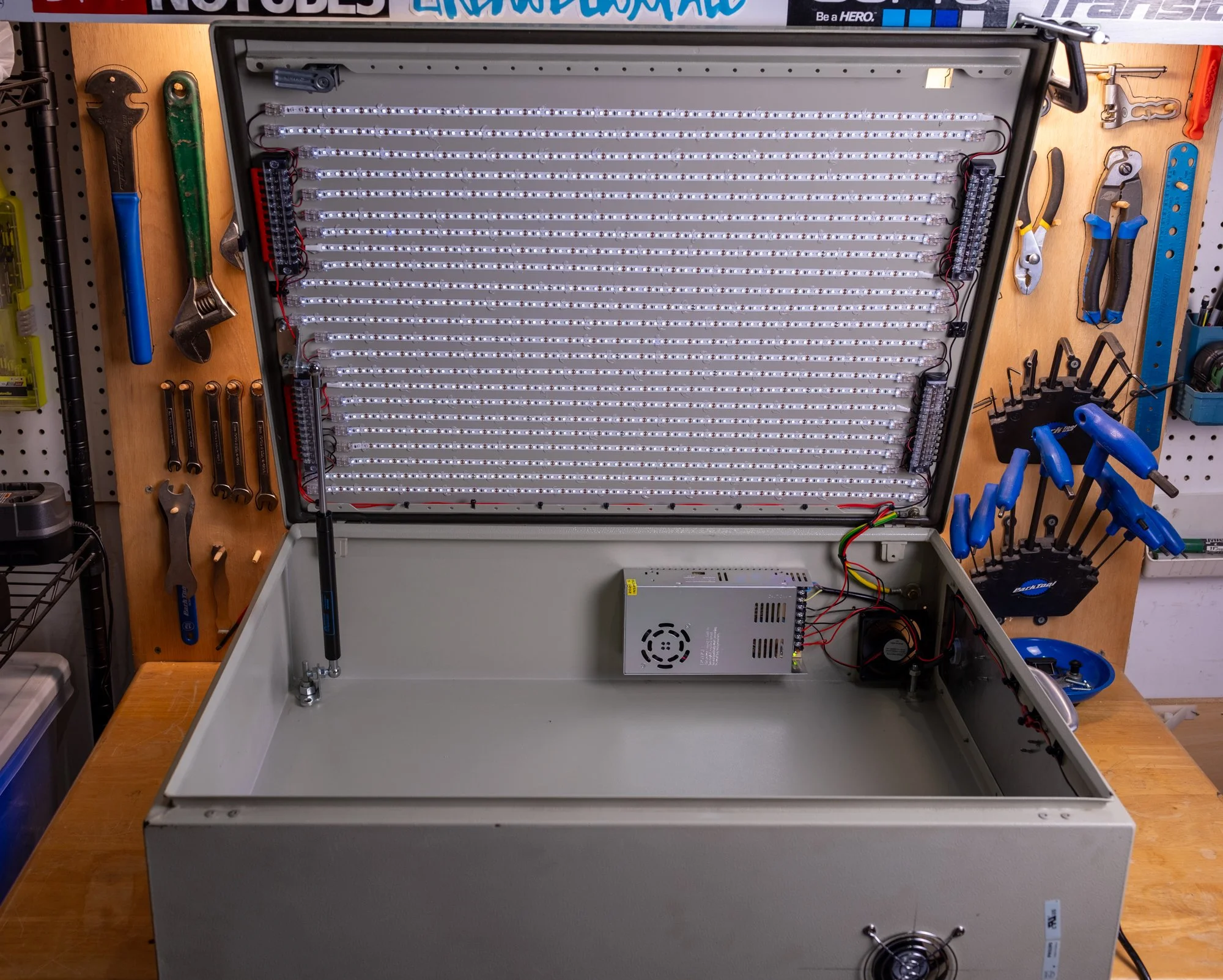 I started the build with the mechanical portion, such as installing a gas strut to hold the lid open, installing the power supply and fans, and then moved on to the electrical components. One important thing to keep in mind when building a UV exposure box using LED light strips is that the LEDs need to be wired in parallel. This maintains consistent light output, and allows you to cut the strips to make them fit into a box. Wiring them in parallel requires LED strip connectors that are then wired into terminal blocks that distribute power to multiple strips.